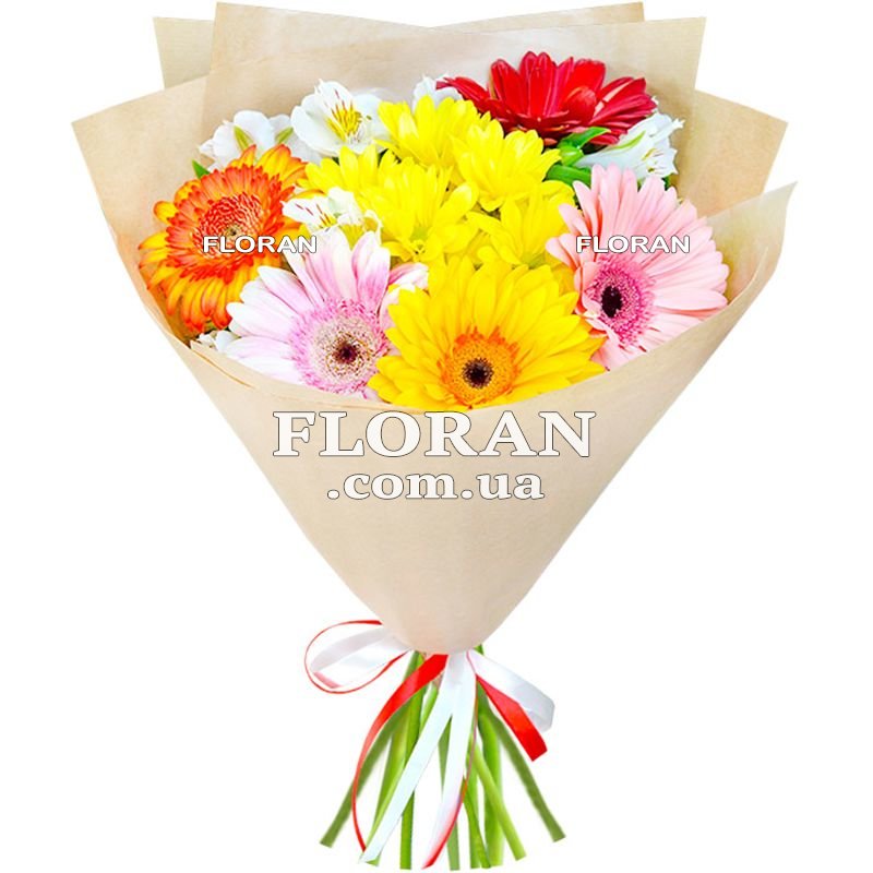 5 разноцветных гербер, 3 белые альстромерии, 1 желтая хризантема, упаковка