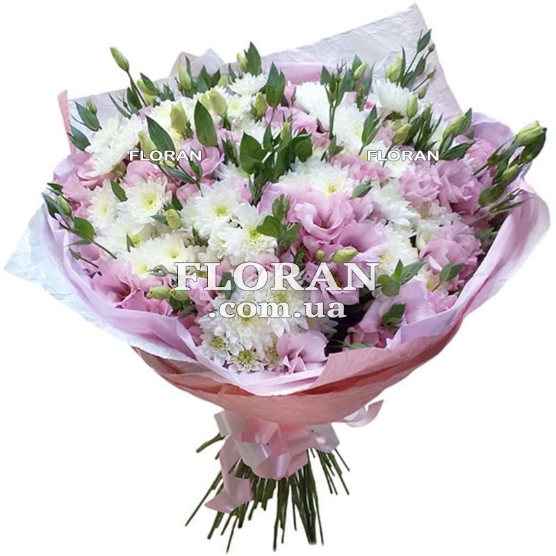 17 розовых эустом, 14 белых хризантем, упаковка
