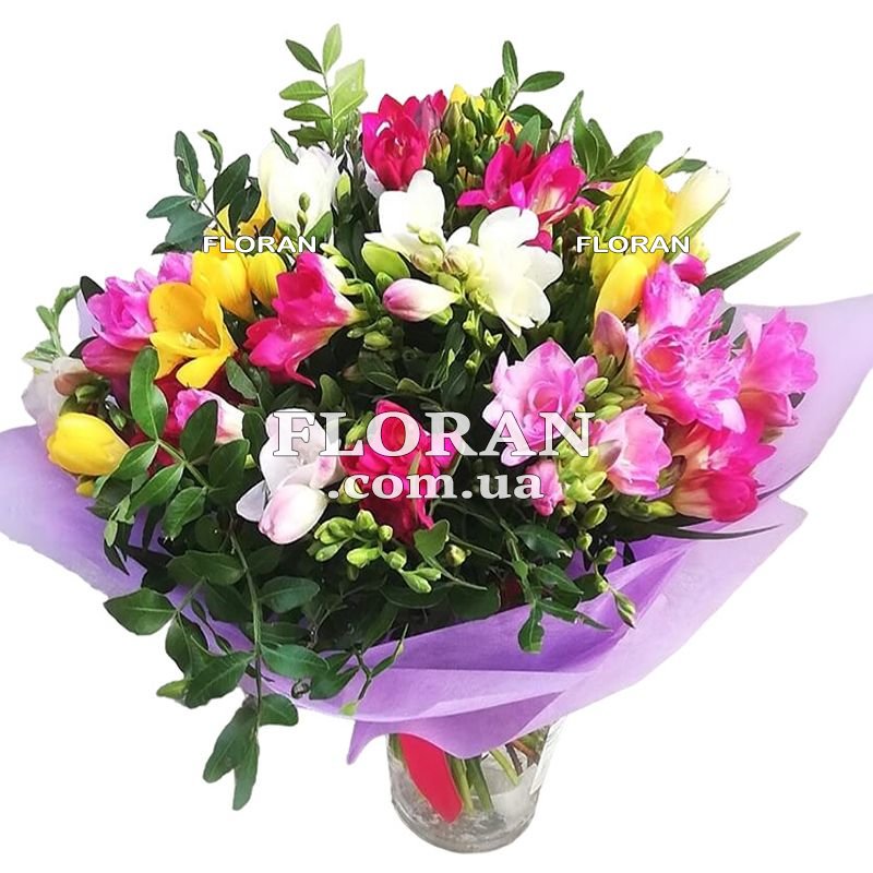 Букет из фрезий - код товара FL-393. Этот прекрасный букет состоит из 17 разноцветных фрезий, которые привлекают внимание своей красотой и изысканностью. Фрезии - это цветы, которые символизируют нежность, чувственность и любовь. Из фрезий можно составить букеты разного цвета, что позволяет подобрать идеальный вариант для любого случая. Букет из 17 фрезий - это прекрасный подарок для любимого человека, родственника или друга. Фрезии - это цветы, которые всегда будут актуальны и популярны.