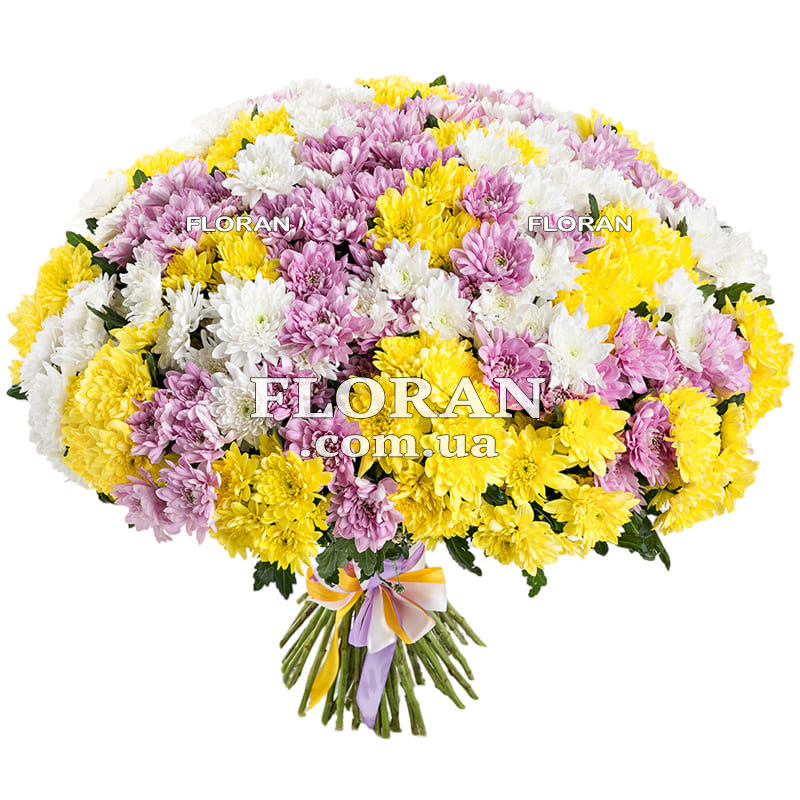 Букет из хризантем - код товара FL-845. Букет из 75 разноцветных хризантем - это впечатляющая и великолепная композиция, которая заполняет пространство своей красотой и яркостью. Этот огромный букет хризантем радует глаз своим разнообразием цветов, создавая настроение праздника и радости. В этом букете можно встретить множество оттенков и цветовых сочетаний хризантем. Розовые, красные, желтые, оранжевые, фиолетовые и другие цвета хризантем прекрасно сочетаются друг с другом, создавая великолепное визуальное впечатление.
