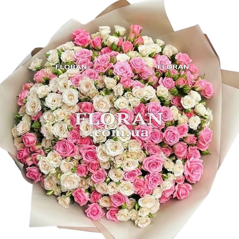 Букет из маленьких розочек - код товара FL-113. Этот букет кустовых роз - настоящая находка для тех, кто ищет нежный и изысканный подарок. В нем собрано 55 кремовых и розовых роз, которые создают неповторимую атмосферу тепла и уюта. Букет из кустовых роз - это ефектный подарок, который подойдет для любого случая. Веточные розы, входящие в состав букета, добавляют ему изюминку и делают его еще более привлекательным. Большой букет из 55 розовых и кремовых роз спрей - это настоящее произведение искусства, которое олицетворяет нежность, красоту и романтику. Кремовые и розовые розы в букете создают нежный и насыщенный образ, который не оставит равнодушным ни одного получателя. Каждая роза спрей в букете добавляет нежности и романтики, подчеркивая общую красоту композиции.