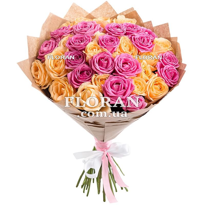 37 персиковых и розовых роз, упаковка