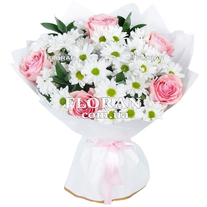 Букет из ромашек и роз - код товару FL-1129. Букет из 5 розовых роз и 6 белых ромашковых хризантем создаст очаровательную комбинацию цветов. Этот букет будет прекрасным выбором для создания атмосферы нежности, натуральной красоты и простоты. Розовые розы являются символом любви, нежности и романтики. Они выражают теплые и нежные чувства, а также воплощают красоту и элегантность. Розы добавят изящество и романтичность в букет, приковывая взгляды и вызывая восторг. Белые ромашковые хризантемы, в свою очередь, являются символом чистоты, свежести и простоты. Они придают букету нежность и привносят ощущение летнего поля с цветущими ромашками. Белые ромашковые хризантемы добавят легкости и непринужденности в композицию.