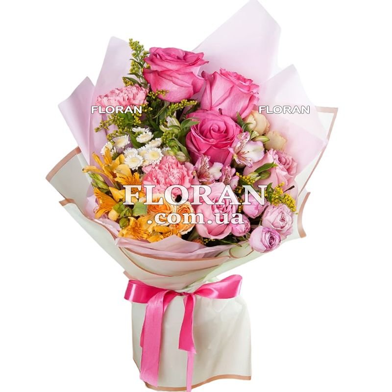 5 розовых роз, 3 кустовые розы, 2 альстромерии, 2 гвоздики, 1 хризантема, упаковка