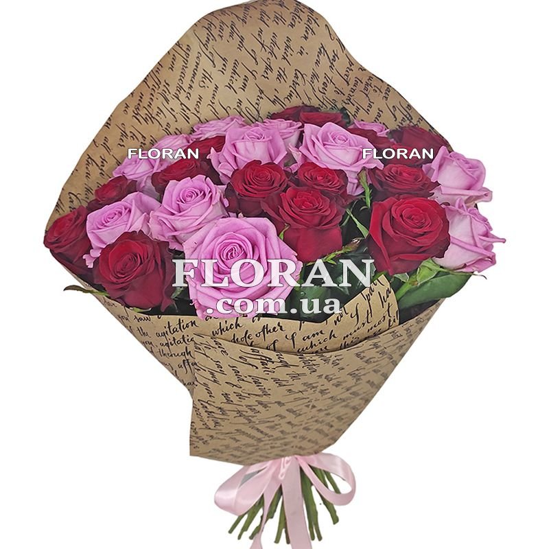 27 красных и розовых роз, упаковка