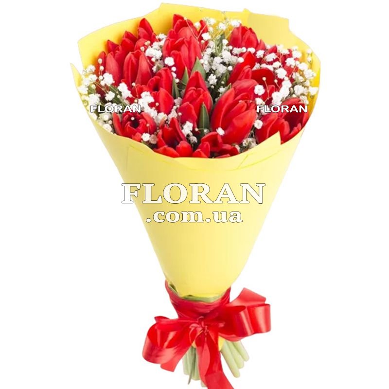 17 красных тюльпанов,гипсофила, упаковка