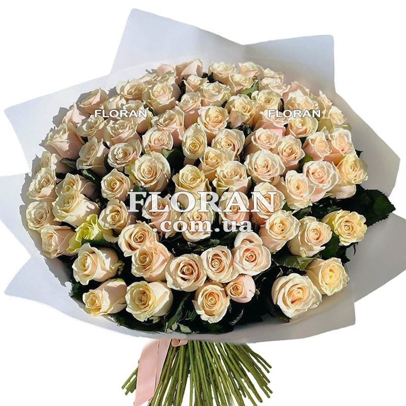 Букет кремового цвета - код товара FL-1430. Восхитительный букет из 101 кремовой розы станет изысканным подарком, добавляющим нежности и изящества любому особому случаю. Кремовые цветы выделяются своей элегантностью и шармом, создавая атмосферу роскоши и утонченности. Композиция из 101 кремовой розы является воплощением изысканности и стиля. Она идеально подходит для особых моментов в жизни, таких как романтические свидания, юбилеи, свадьбы или дни рождения. Кремовые цветы символизируют нежность, чистоту и гармонию, что делает этот букет особенно значимым. Каждая роза в букете имеет длину стебля 60 см, что придает ему величественности и привлекательности. Благодаря высокому качеству и свежести цветов, этот букет сохранит свою красоту и привлекательность на протяжении длительного времени. Вы можете заказать этот великолепный букет кремовых цветов онлайн, выбрав удобный способ доставки. Букет будет тщательно упакован, чтобы гарантировать сохранение его свежести и великолепного вида при доставке. Подарите 101 кремовую розу своим близким, родным или любимым, чтобы выразить свою любовь, уважение и благодарность. Этот букет станет прекрасным символом вашей привязанности и заботы, оставляя незабываемое впечатление и запечатлевая самые нежные моменты в сердцах получателей.