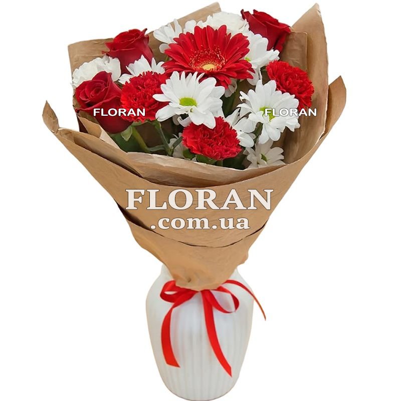 Этот особый букет состоит из 1 красной герберы, символизирующей энергию и силы, которые учителя вкладывают в свою работу. Три красные розы, которые в нем присутствуют, воплощают любовь, преданность и уважение к учителям, которые влияют на наши жизни. Три красные гвоздики добавляют в букет изящества и выразительности, они символизируют приверженность и благодарность. Две белые хризантемы дарят букету чистоту, нежность и безупречность. Вся композиция оформлена в стильную упаковку, которая придает букету завершенный вид и защищает его от повреждений.