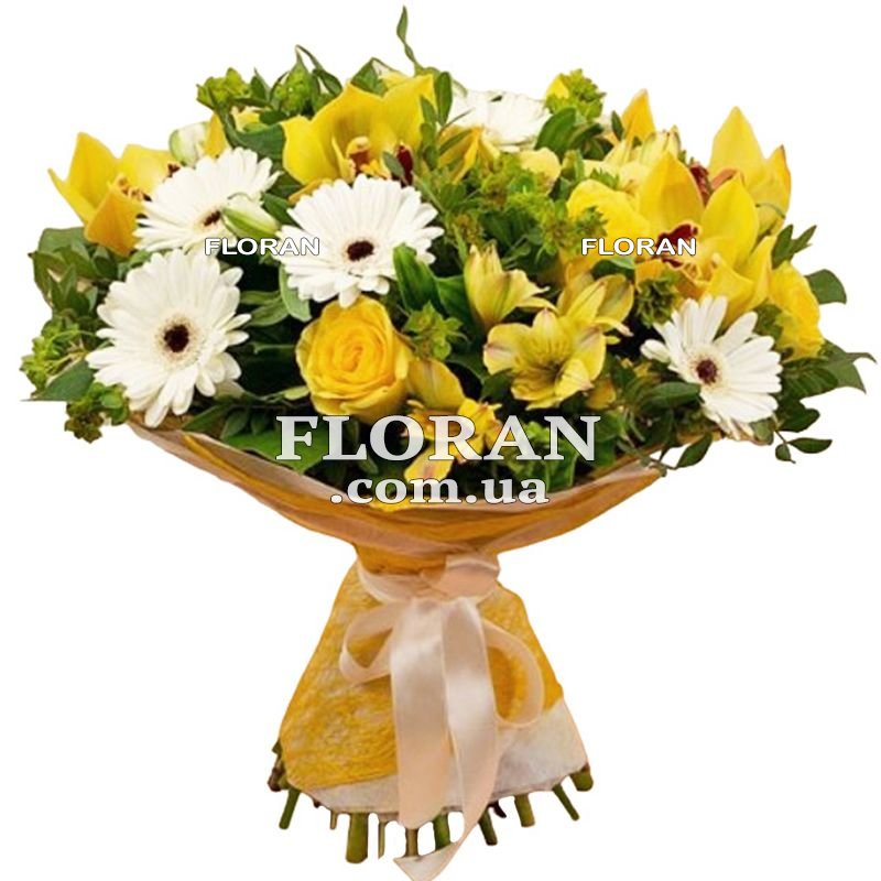 5 желтых орхидей, 5 белых или кремовых гербер, 7 желтых роз, 8 желтых альстромерий, упаковка