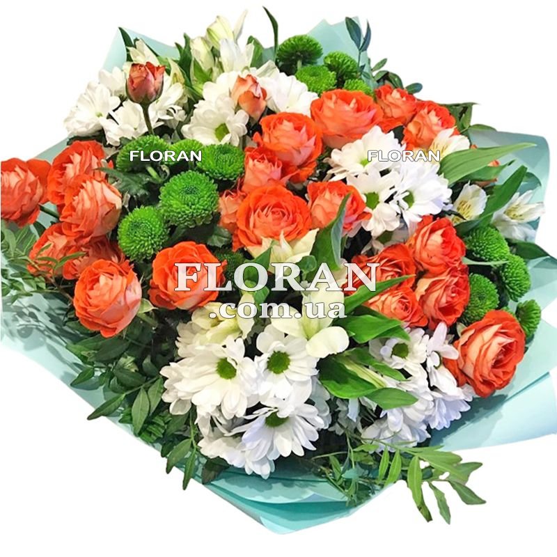 Букет на Юбилей - код товару FL-1353. Представляем вам особенный букет, созданный специально для этого знаменательного события. В его составе вы найдете пять оранжевых кустовых роз, которые символизируют энергию и радость. Восемь белых и зеленых хризантем добавляют нежности и свежести, а четыре белые альстромерии подчеркивают особый характер этого дня. Зелень и упаковка завершают композицию, придавая ей завершенность и элегантность. Этот букет является прекрасным подарком на Юбилей, воплощая в себе пожелания красоты, процветания и радости. Поздравьте юбиляра/юбилярку этим особенным букетом и подарите им незабываемые моменты счастья и восхищения.