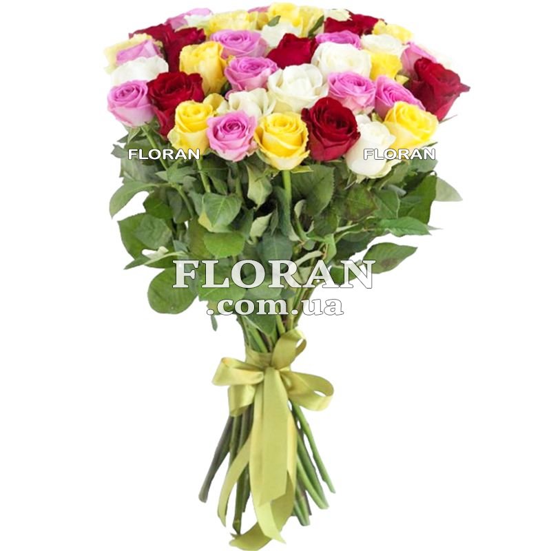 Букет перевязан лентой - код товара FL-732. Представьте себе великолепный букет из 41 разноцветной розы, нежно перевязанный элегантной лентой. Этот букет является ярким проявлением красоты и разнообразия цветов, воплощая в себе уникальность и индивидуальность каждой розы.