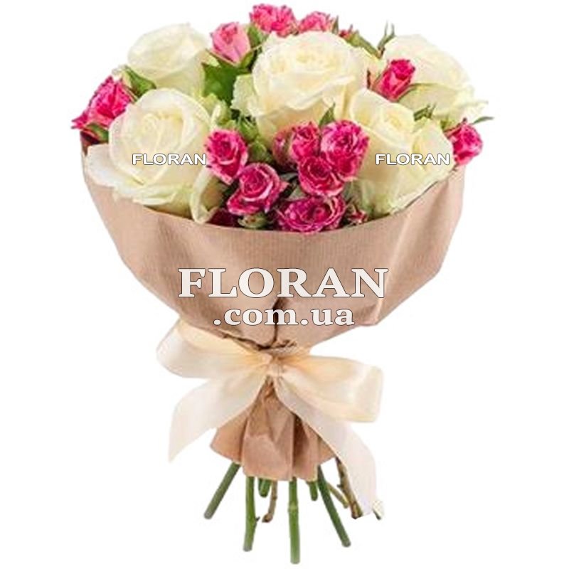 5 белых роз, 4 розовые кустовые розы, упаковка