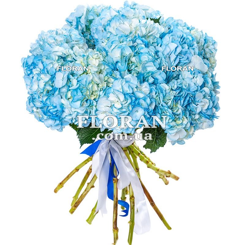 Букет с голубой гортензией - код товара FL-405. Голубые гортензии - настоящая находка для тех, кто любит нежные цветы. 15 голубых гортензий в букете создадут ощущение нежности и спокойствия, идеально подходя для декорирования спальни или гостиной.