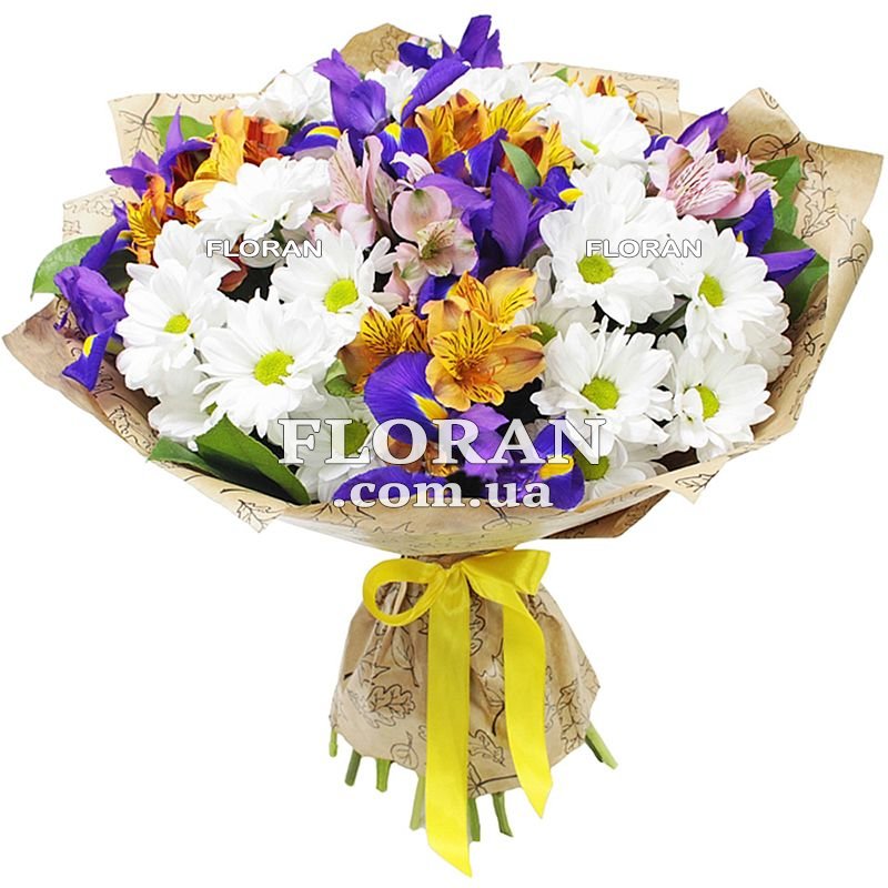 Букет с хризантемами, альстромериями и ирисами