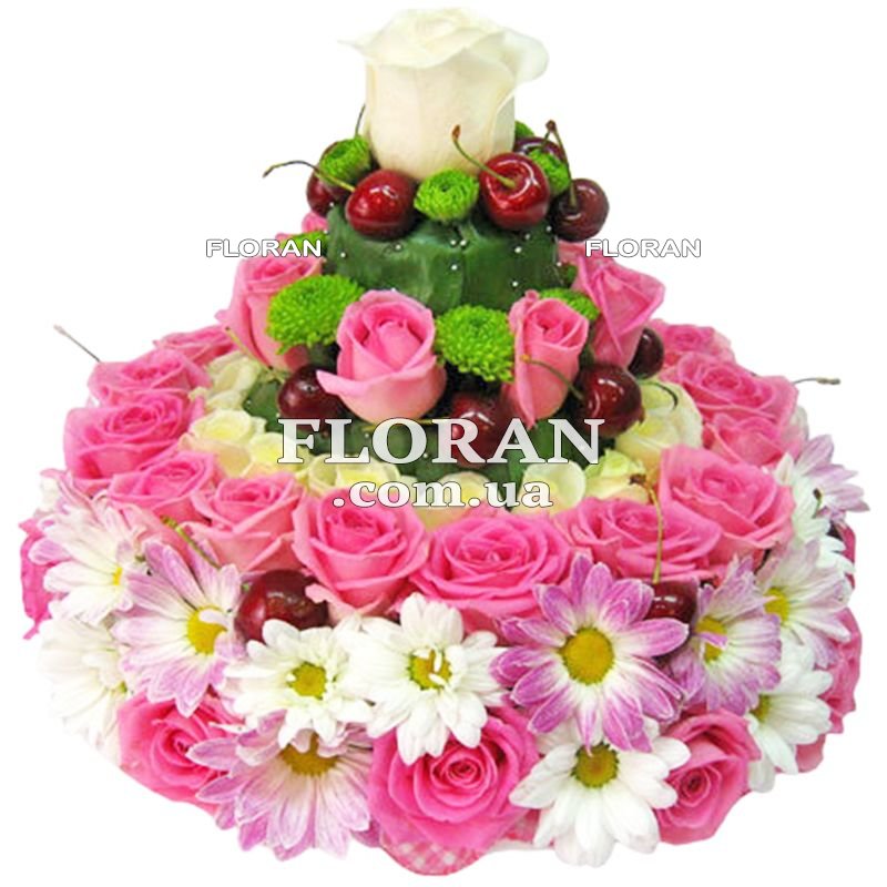 Цветочный торт - код товара FL-280. Этот торт из цветов - настоящее произведение искусства! Он состоит из 55 розовых и белых роз, белых, розовых, зеленых хризантем и 15 вишен или черешен в сезон. Флористическая основа торта позволяет ему сохранять свою форму и красоту на протяжении долгого времени.