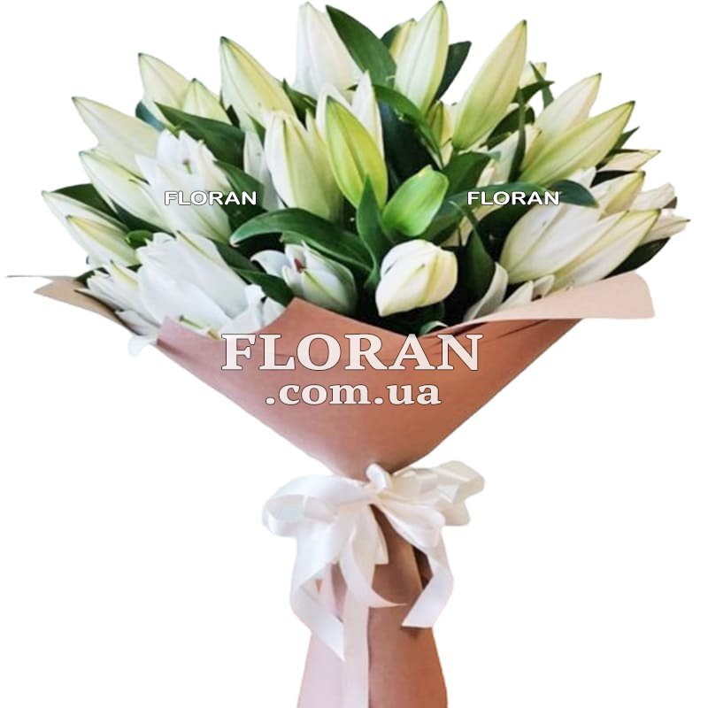 Цветы белые лилии букет - код товара FL-1022. Белые лилии - это величественные цветы, символизирующие чистоту, нежность и элегантность. В этом прекрасном букете состоит 13 белых лилий, создающих впечатление изысканости и возвышенности. Каждая белая лилия в этом букете представляет собой настоящее произведение природы. Их изящные формы и нежные лепестки привлекают взгляды и наполняют пространство изысканным ароматом. Белые лилии - это не только красивые цветы, но и символы чистоты и невинности.
