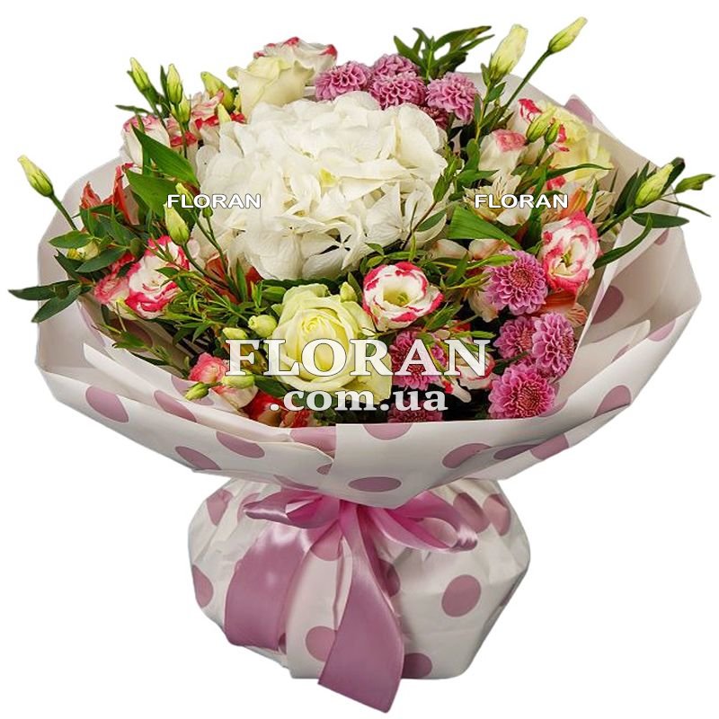 Цветы для жены - код товару FL-1198 - это прекрасный способ выразить свою любовь и заботу. Вот красивый букет, который я могу порекомендовать: 1 белая гортензия, 3 белые розы, 3 розовые хризантемы, 7 эустом, 3 альстромерии и упаковка. Белая гортензия является символом бесконечной любви и привязанности. Она также ассоциируется с чистотой, благополучием и душевным покоем. Белая гортензия в букете будет передавать нежные чувства и показывать вашу преданность. Белые розы - это символ чистоты, нежности и искренней любви. Они являются классическим выбором для выражения романтических чувств. Каждая белая роза будет говорить о вашем восхищении и внимании к жене. Розовые хризантемы добавят нежности и изысканности в букет. Они символизируют долголетие, дружбу и благополучие. Розовый цвет хризантем будет подчеркивать вашу нежность и заботу о жене. Эустома - это цветок с нежными лепестками, который символизирует благополучие и доброе сердце. Он добавит свежесть и аромат в букет, придавая ему особую привлекательность. Альстромерии - это элегантные цветы, которые символизируют прекрасные мгновения и привязанность. Они будут приносить радость и напоминать о ваших счастливых моментах вместе. Упаковка букета придаст ему завершенный вид и добавит таинственности. Этот букет из белой гортензии, белых роз, розовых хризантем, эустом и альстромерий будет великолепным подарком для вашей жены. Пусть каждый цветок передает вашу любовь, преданность и благополучие. Пусть этот букет напоминает вашей жене насколько вы ее любите и цените.