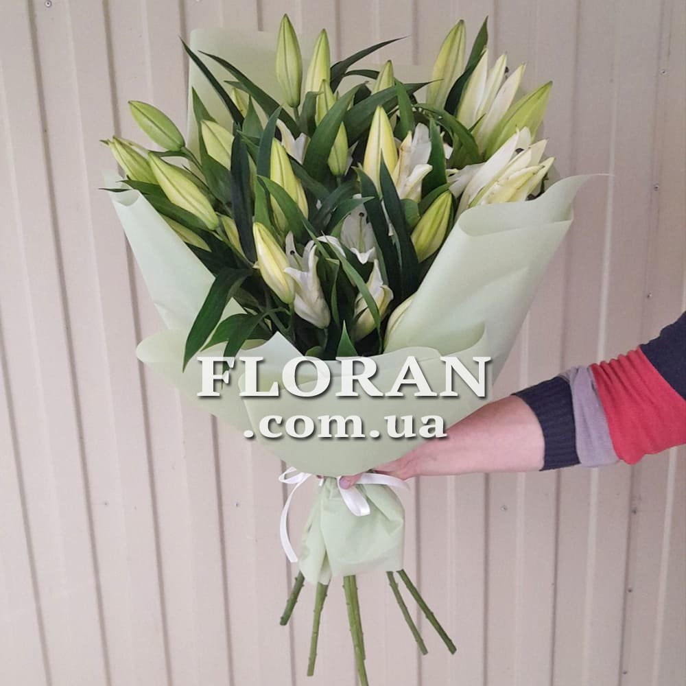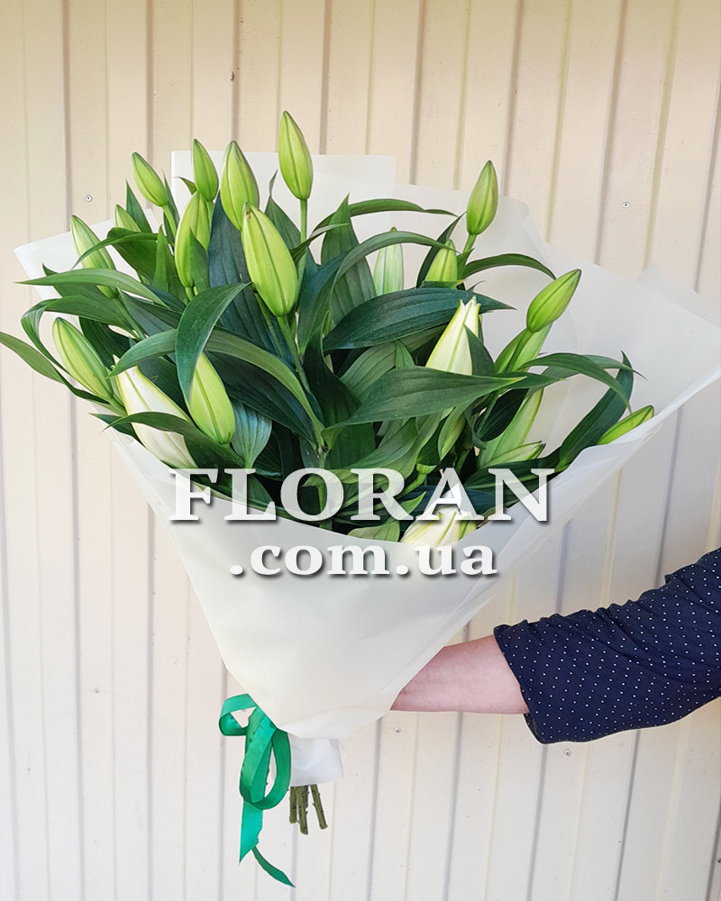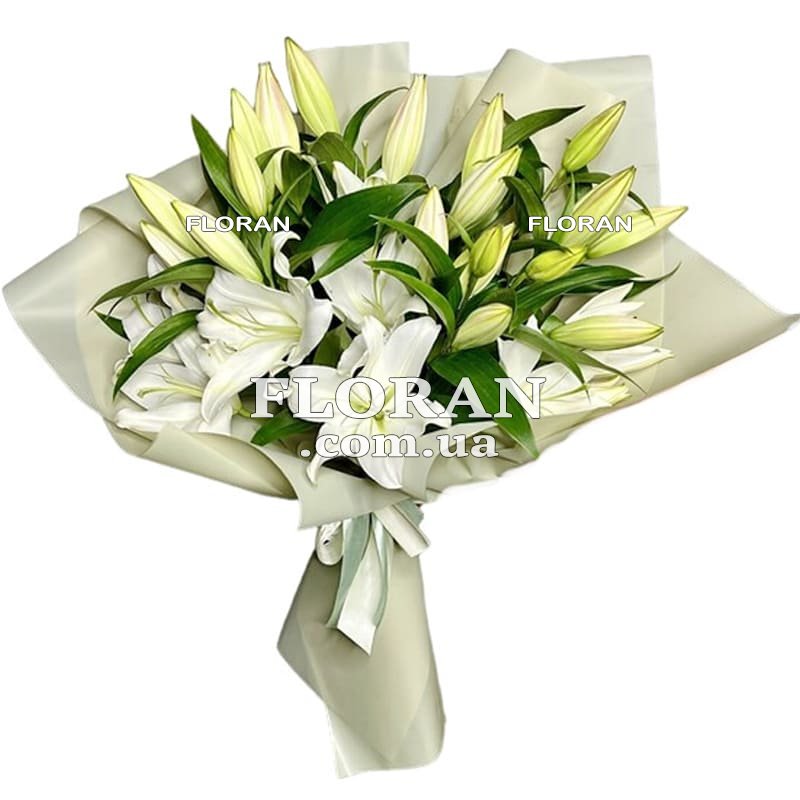 Цветы лилии букет - код товара FL-1021. Цветы лилии - это прекрасное проявление элегантности и изысканности. В этом нежном букете состоит 7 белых лилий, которые восхищают своей красотой и излучают неповторимый аромат. Белые лилии символизируют чистоту, нежность и невинность. Они являются источником вдохновения и прекрасным способом выразить свои чувства и эмоции. Букет из 7 белых лилий является знаком возвышенности и грации, который непременно понравится получателю.