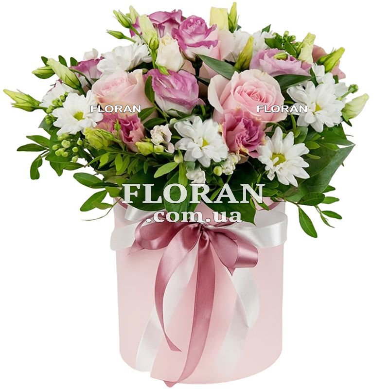 Цветы в коробке на подарок - код товара FL-2996 - идеальный подарок для создания неповторимых моментов. Пять розовых роз символизируют нежность и любовь, четыре розовые эустомы добавляют изысканности, а белые хризантемы придают композиции свежесть и чистоту. Такой подарок подходит для любого случая, будь то день рождения, юбилей, или просто желание сделать день особенным. Зелень, используемая в композиции, добавляет натуральность и естественность. Коробка, в которой представлен букет, создает впечатление утонченности и стиля. Этот живописный ансамбль цветов — ваш личный шедевр, который будет дарить радость и восхищение, олицетворяя ваши теплые пожелания и заботу.