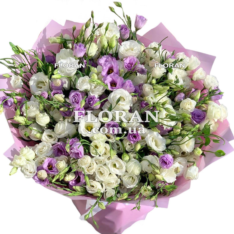 Эустома в букете - код товара FL-1018. Великолепный букет из 75 белых и фиолетовых эустом. Эта комбинация эустомы создаст неповторимый и прекрасный образ, который порадует глаз и дарит нежность. Белые эустомы символизируют чистоту, нежность и гармонию. Они придают букету изысканость и элегантность. Фиолетовые эустомы, в свою очередь, добавляют нотку загадочности, роскоши и индивидуальности.