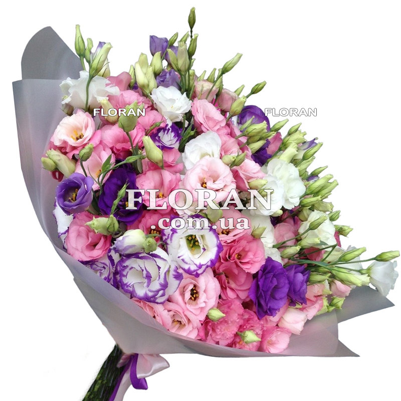 Эустомы в букете - код товара FL-1001. Прекрасный букет с эустомами, в котором гармонично сочетаются 51 разноцветная эустома. Эти нежные цветы привнесут в ваш букет красоту и изысканность. Разноцветные эустомы создают удивительное разнообразие оттенков, от ярких и насыщенных до нежных и пастельных. Они олицетворяют красоту природы и ее богатство. Каждая эустома в этом букете имеет свою уникальную окраску, что делает его особенным и привлекательным. Разнообразие цветов добавляет игривости и жизнерадостности, создавая впечатление настоящего цветочного феерверка.