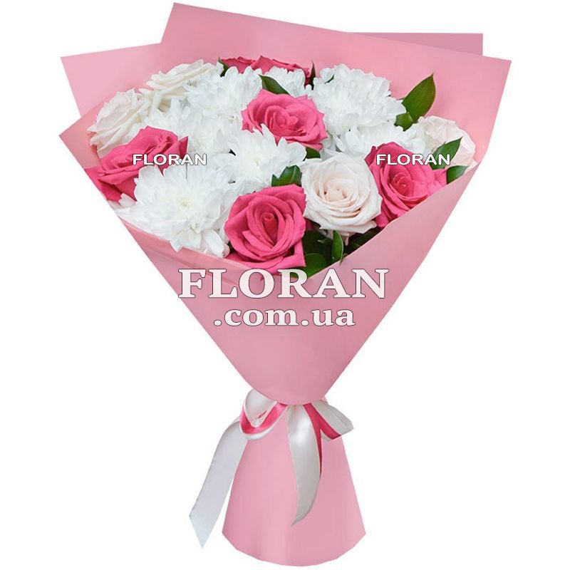 11 розовых и кремовых роз, 4 белые хризантемы, упаковка