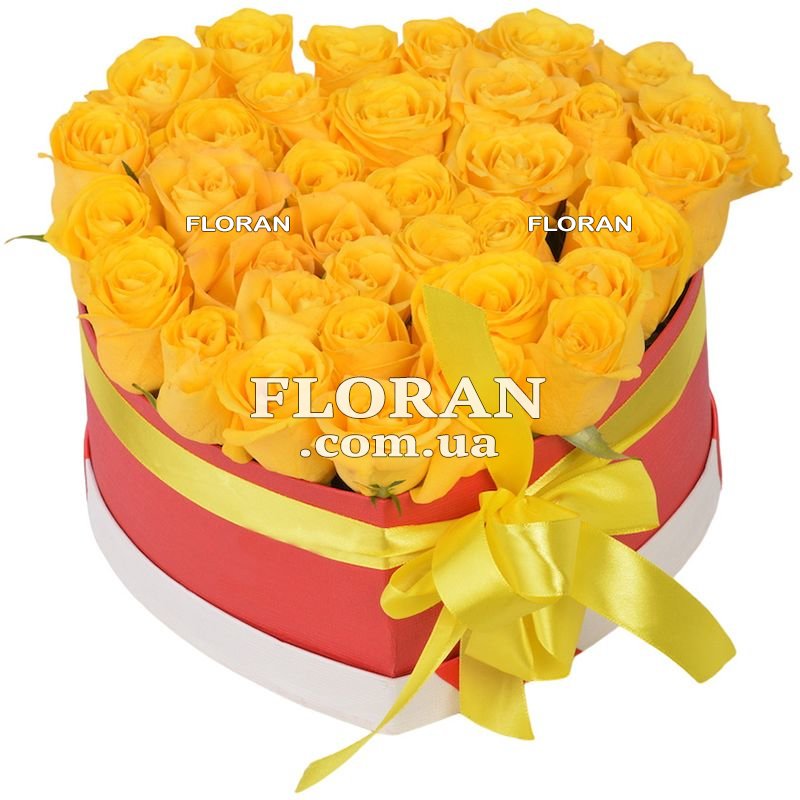 Композиция из цветов в коробке сердце - код товара FL-266. Эта удивительная композиция из цветов в форме сердца станет прекрасным подарком для любимого человека. В ней собраны 37 желтых роз, которые символизируют солнце и радость. Кроме того, композиция из роз дополнена другими цветами, которые придают ей особую изящность и шарм. Эта цветочная композиция выполнена в основном из желтого цвета, который является символом дружбы и счастья.