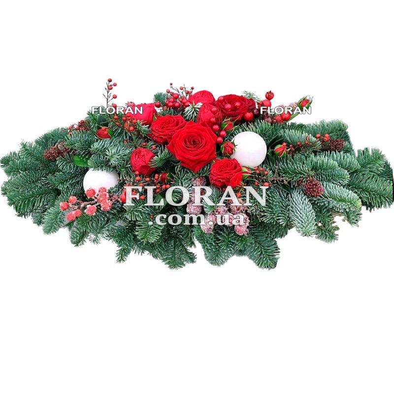 Композиция из роз и ели на стол - код товара FL-2155. Эта композиция из роз и ели станет великолепным украшением вашего новогоднего стола и создаст праздничную атмосферу, наполнив помещение уютом и волшебством. В ней сочетаются красные розы - символ страсти и любви, и елочные шары, что делает ее идеальным дополнением к новогоднему декору. Ветки ели или сосны добавляют композиции аромат свежей хвои, который придаст вашему столу атмосферу зимнего леса. Этот подарок также можно использовать как элемент декора на вечеринке, корпоративном мероприятии или домашнем новогоднем застолье. Пусть каждая красная роза станет символом добра и радости в этот особенный праздничный момент. С этой композицией вы сможете создать атмосферу тепла и счастья в кругу семьи и друзей. Наслаждайтесь вместе новогодним столом, делясь радостью и теплом ваших отношений.
