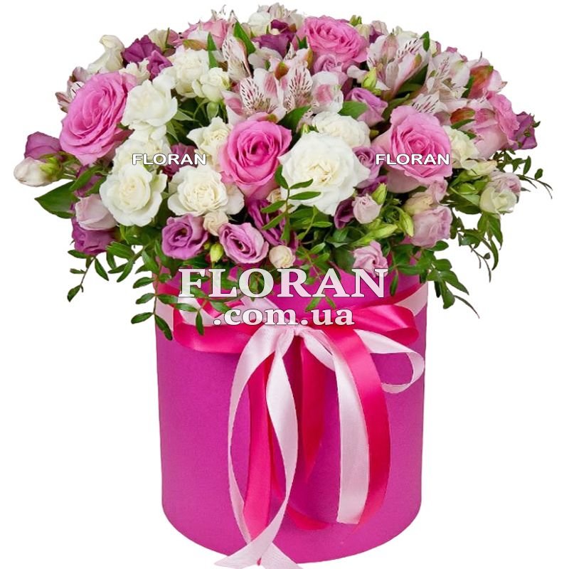 Коробка цветов для любимой девушки - код товара FL-2994 - настоящий вихрь нежности и чувств! Для твоей любимой девушки мы подготовили настоящий цветочный фейерверк: девять розовых роз, воплощающих страсть и волнение, восемь белых (или кремовых) кустовых роз, символизирующих чистоту и нежность, четыре розовые альстромерии, вносящих штрихи загадочности, и шесть розовых эустом, придающих всему композиции неповторимую изысканность. Представь, как замирает ее сердце, когда она открывает этот шикарный подарок! Яркие краски, восхитительные ароматы, каждый цветок словно прошептывает: Ты особенная! Это не просто букет, это часть твоих чувств, твоей заботы, твоей любви, упакованная в каждую коробочку. Вау-эффект от этого подарка — гарантирован!