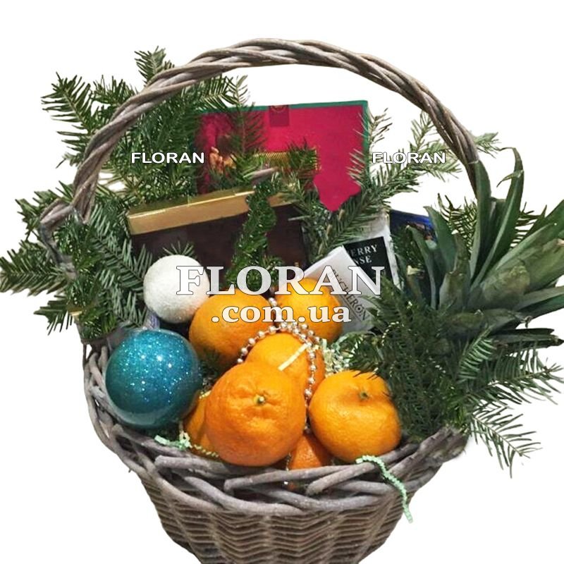 Корзина новогодняя на подарок - код товара FL-2112. Новогодние праздники – лучшее время для вкусной еды и хороших напитков. Это также прекрасные дни, чтобы дарить и принимать подарки. Мы дарим их родителям, детям, знакомым, коллегам по работе, партнерам по бизнесу. Вы можете купить корзину на Новый Год, а курьерская служба интернет-магазина доставит её непосредственно ко входной двери получателя – на дом или в офис в любом населенном пункте по Украине. Корзина новогодняя на подарок - это настоящая праздничная радость в каждом элементе. Она наполнена свежими фруктами, вкусными конфетами и шоколадом, а также праздничным декором. Ананасы, апельсины и мандарины приносят свежесть и аромат к праздничному столу, а коробки с различными видами конфет и плитками шоколада удовлетворят сладкий зуб и добавят нотки роскоши к вашему подарку. Новогодние шары и ветки ели или сосны создают атмосферу праздника и добавляют этой корзине неповторимый декоративный шарм. Эта корзина подарит радость и удовольствие тем, кто ее получит. Она идеально подходит как подарок для друзей, семьи или коллег во время новогодних праздников.