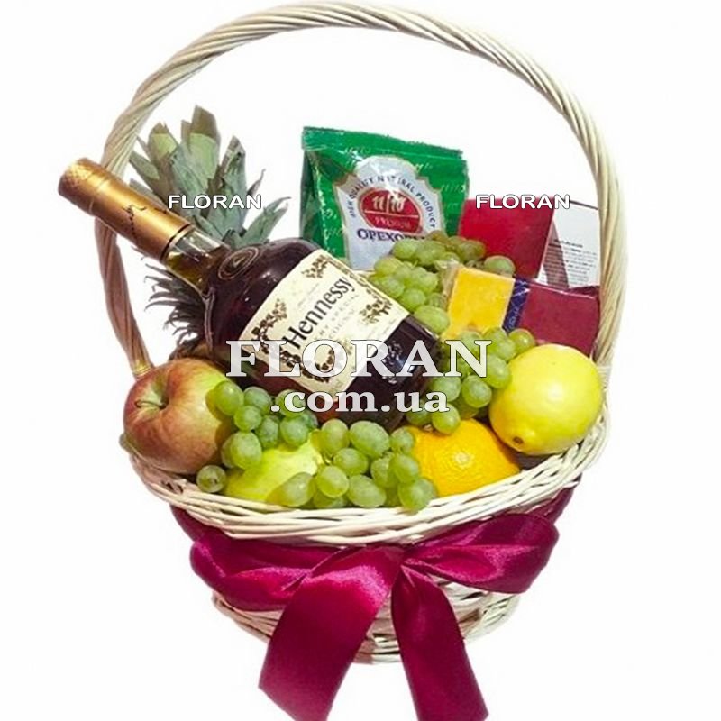 ананас, яблоки – 5 шт., апельсин 4 шт., лимон – 2 шт., виноград, печенье 1 упаковка, сыр твердый – 1 шт., смесь орехов 100-150 г, коньяк Hennessy VS 0.5 л (в подарок)