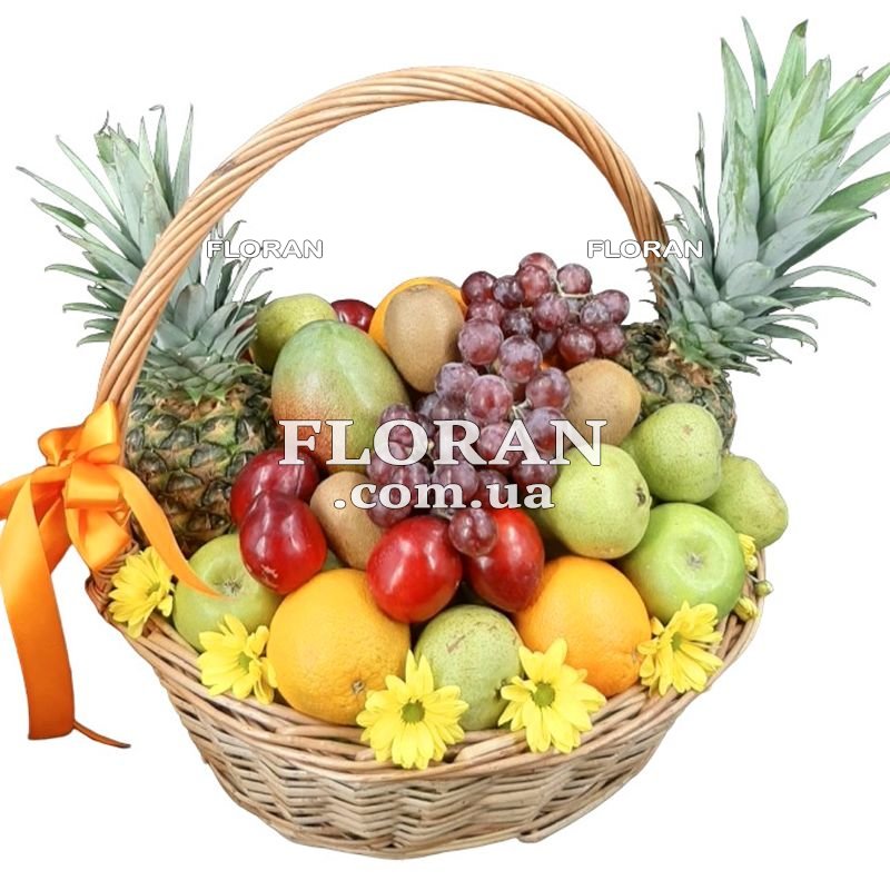 2 ананасы, апельсины, яблоки, киви, груши, сливы или др. сезонные фрукты, виноград 2 грозди, хризантема