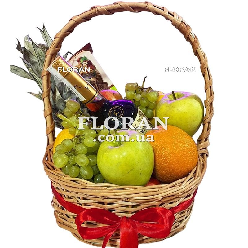 ананас, яблоки, апельсины, лимоны, виноград, плитка шоколада – 1 шт., коньяк Hennessy VS 0.5 л (в подарок)