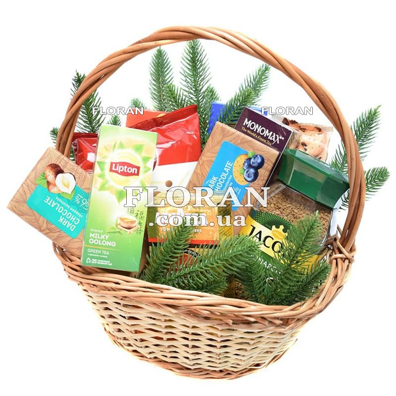 Корзина с подарками на новый год - код товара FL-607. Эта новогодняя подарочная корзина будет прекрасным подарком для любителей чая и кофе! В ней вы найдете разнообразные сорта кофе и чая, а также вкусное печенье и круассаны, которые можно наслаждаться вместе с напитками. Дополнительно в корзине есть две плитки шоколада, которые добавят приятных вкусовых ощущений.