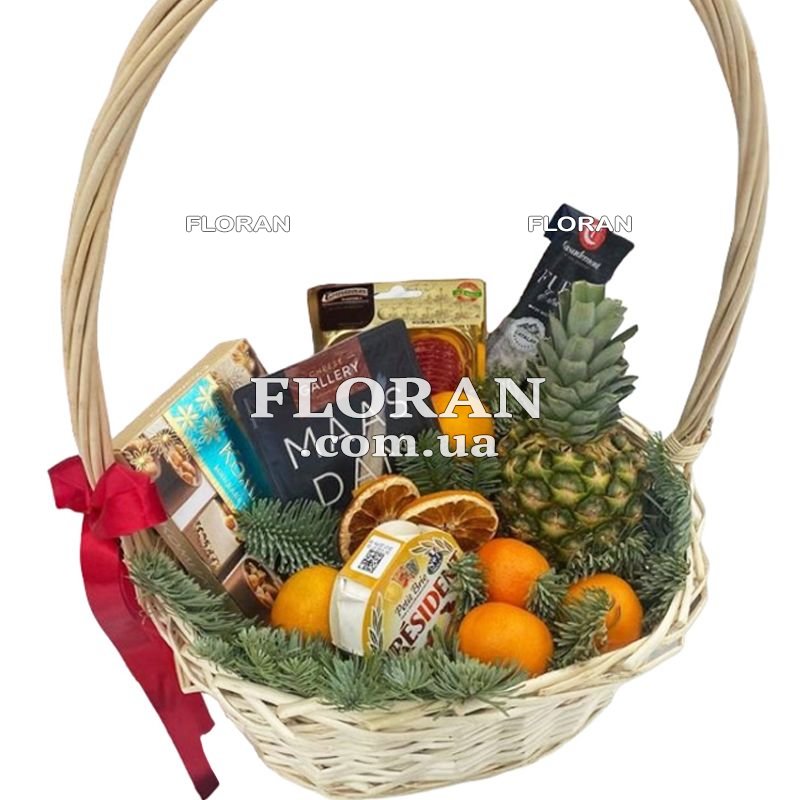 Корзина с подарками на Рождество - код товара FL-2101 - истинное воплощение праздничного волшебства и вкуса. Она идеально подходит для подарка друзьям, близким и коллегам, создавая праздничное настроение и радость. Ананас и мандарины добавляют яркие цвета и свежесть к этому подарку. Сыр полутвердый и колбаса нарезка - отличные компоненты для создания праздничных закусок. Колбаса фуэт и сыр Бри или Камамбер привнесут нотки изысканности и утонченности в новогодний стол. Коробка конфет дарит сладкие моменты радости и делает этот подарок еще более незабываемым. Ветки ели или сосны придают композиции атмосферу Рождества и создают уют в доме. Эта корзина с подарками на Рождество - прекрасное выражение вашей заботы и внимания к близким в этот особенный праздник. Пусть она станет символом вашей радости и теплых пожеланий в этот Рождественский сезон.