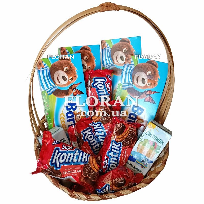 Корзина со сладостями для детей - код товара FL-2045. Эта волшебная корзина со сладостями - настоящий праздник для детей. Ведь, как известно, сладости делают жизнь ярче и волшебнее, а в этой корзине вы найдете множество вкусных сюрпризов, которые подарят море радости вашему сыну, дочке, племяннику или крестнице. Что же скрывается в этой корзине: Бисквит Барни - нежные и ароматные бисквиты, которые несомненно понравятся вашим малышам. Печенье Контик - хрустящее и вкусное печенье, идеальное для уютных чаепитий. Нектар - свежие фруктовые напитки, которые дарят заряд бодрости и радости. Этот подарок подходит для разных случаев: это может быть День Рождения, День Ангела, Новый Год или День Святого Николая. В любой из этих дней вашим детям будет особенно приятно получить такой сладкий сюрприз. Моменты детства - это время чудес и волшебства, и мы с удовольствием поможем вам создать яркие воспоминания для ваших самых маленьких. Закажите эту корзину прямо сейчас, и мы доставим ее в любой уголок, чтобы усилить радость вашим близким!