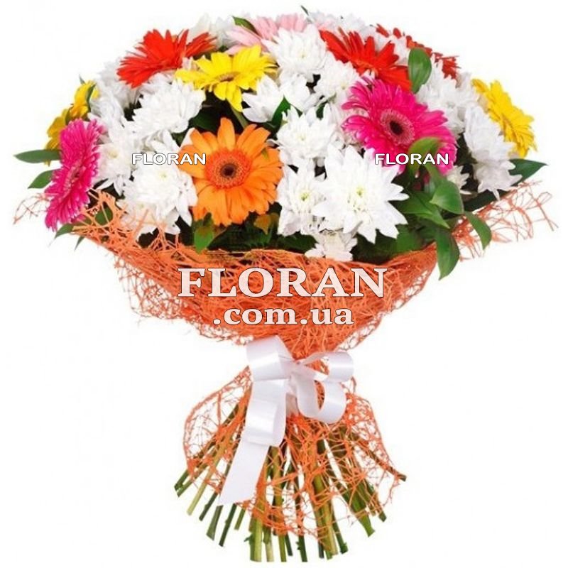 Красивый букет из хризантем и гербер - код товару FL-1146 - это великолепная композиция, которая радует глаз и приносит радость своим яркими красками и изящным сочетанием цветов. В этом букете используются 11 разноцветных гербер и 10 белых хризантем, создавая впечатляющий и элегантный образ. Разноцветные герберы становятся главными героями этого букета. С их помощью можно передать широкий спектр эмоций и настроений, ведь герберы доступны во множестве оттенков, от ярких и насыщенных до нежных и пастельных. Комбинация разноцветных гербер добавляет яркости, жизнерадостности и позитива в букет, что делает его прекрасным выбором для любого особого случая или подарка. Белые хризантемы, в свою очередь, придают букету нежности, чистоты и элегантности. Они символизируют чистоту души, надежность и нежность. Белые хризантемы создают основу для этого букета, обрамляя яркие герберы и создавая контрастное и гармоничное сочетание цветов.