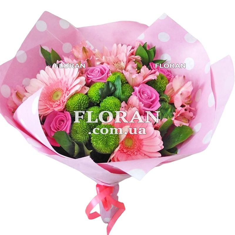 Красивый букетик цветов - код товару FL-1273. Этот букетик – прекрасный способ подарить радость и улыбку особенному человеку. В его состав входят 3 розовые герберы, 5 розовых роз, 5 розовых альстромерий, 4 зеленые хризантемы и упаковка, которая завершит его элегантный вид. Розовые герберы – символизируют нежность, чистоту и радость. Они придают букету легкость и игривость, создавая атмосферу праздника и восторга. Розовые розы – это классический символ любви и красоты. Они являются идеальным выбором для выражения нежных чувств и признания в любви. Розовые альстромерии – символизируют прекрасные моменты и счастливые воспоминания. Они добавят букету изящество и гармонию, а также подчеркнут важность особых моментов в жизни. Зеленые хризантемы – символ свежести и жизни. Они придают букету яркий акцент и добавляют свежести и энергии. Упаковка букета завершает его образ и придает ему дополнительную элегантность. Вы можете выбрать упаковку, которая отразит стиль и предпочтения получателя. Будь то стильная обертка или роскошный бант, упаковка добавит завершенности и особенности к вашему подарку. Этот красивый букетик с розовыми герберами, розами, альстромериями и зелеными хризантемами станет прекрасным символом вашего внимания и заботы. Он принесет радость и счастье, создаст атмосферу любви и нежности. Этот букет яркий, элегантный и полон жизни, и он станет прекрасным подарком для любого особого случая или просто для того, чтобы сделать чей-то день особенным.