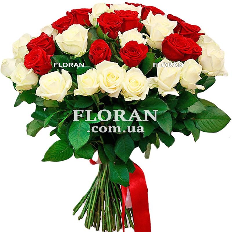 Красно белый букет цветов - код товара FL-656. Красно-белый букет цветов - это красивое сочетание ярких и контрастных цветов, которое подходит для многих случаев, начиная от свадеб и юбилеев, до просто подарка на праздник. В этом букете содержится 45 украинских роз, которые являются одними из самых популярных цветов для такого типа букетов. Красные розы являются символом любви, страсти и романтики, в то время как белые розы символизируют чистоту, невинность и духовную красоту. Красно-белый букет цветов может быть идеальным подарком для свадьбы или для Дня Святого Валентина. Красные и белые розы вместе создают впечатляющий контраст, который выглядит очень эффектно.