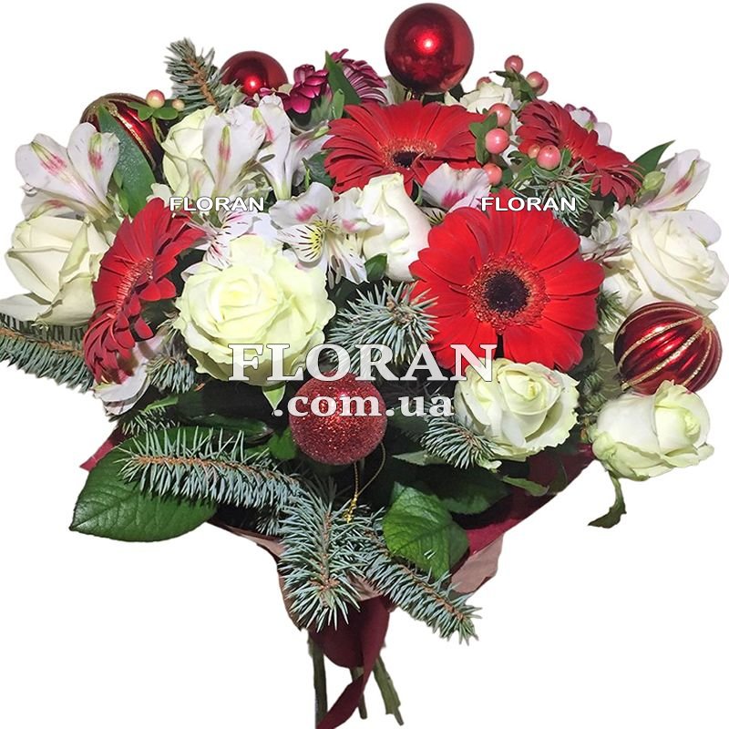 5 красных гербер, 9 белых роз, 5 белых альстромерий, 5 елочных шаров, ветки ели или сосны, упаковка