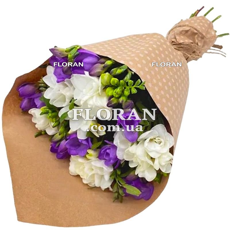 Небольшой букет фрезий - код товара FL-1594 - состоящий из 13 белых и фиолетовых цветков, представляет собой прекрасный вариант подарка для любого случая. Фрезии - это изысканные цветы с нежным ароматом, которые придают особый шарм и элегантность любому букету. В этом букете белые и фиолетовые фрезии сочетаются в гармонии, создавая впечатляющий цветовой контраст. Белые фрезии символизируют чистоту, невинность и свежесть, а фиолетовые фрезии добавляют загадочности и изысканности. Этот сочетание цветов создает яркое и привлекательное зрительное восприятие. Букет упакован аккуратно и стильно, что придает ему завершенный вид. Упаковка обеспечивает защиту цветков и придает букету дополнительную эстетическую привлекательность. Она также делает его удобным в транспортировке и передаче. Небольшой букет фрезий с упаковкой может быть прекрасным подарком для различных поводов - от дня рождения и юбилея до праздника или просто для выражения своей заботы и любви к близкому человеку. Фрезии будут символом нежности, восхищения и радости. Этот нежный и изящный букет фрезий создаст атмосферу тепла и уюта, поднимет настроение и оставит приятные впечатления. Он является проявлением вашего внимания и заботы о получателе. Небольшой букет фрезий с упаковкой - это прекрасный способ порадовать и удивить вашу близкую душу и показать, что вы думаете о ней.