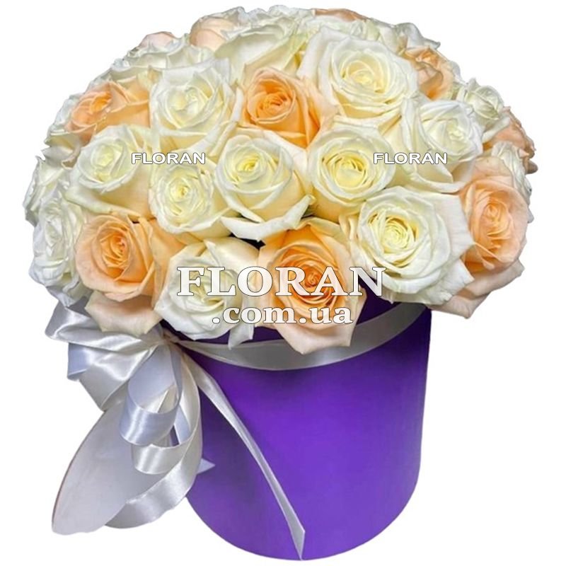 49 белых и персиковых роз, коробка