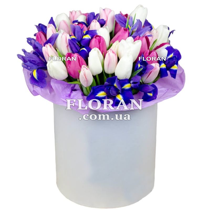 38 белых и розовых тюльпанов, 13 ирисов, коробка