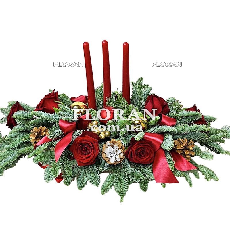 Новогодняя композиция со свечами на стол - код товара FL-599. Данная новогодняя композиция со свечами на стол - это прекрасный выбор для того, чтобы порадовать своих близких или коллег в преддверии новогодних праздников. Этот подарок привнесет атмосферу уюта и праздника в любой дом или офис. Сочетание красных роз и елочных шаров, а также наличие трех свечей, создают уютную и романтичную атмосферу. Ветки ели или сосны придают композиции еще большую праздничность, а наличие новогоднего декора добавляет подарку особого шарма. Получить такой подарок приятно не только визуально, но и эмоционально. Он создаст тепло и уют в доме, а свечи придают ощущение спокойствия и релаксации. Этот подарок станет прекрасным дополнением к любому новогоднему столу, а также отличным способом выразить свою любовь и заботу о близких людях.