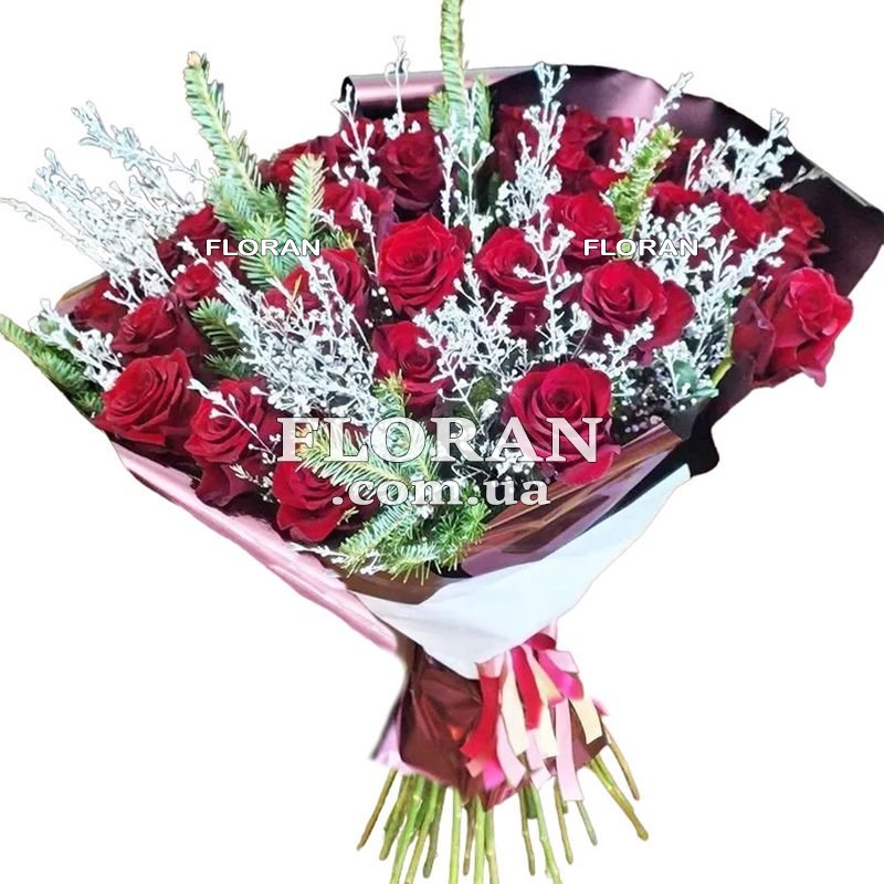 Новогодний букет из красных роз - код товара FL-2230 - это символ страсти, любви и радости, который прекрасно подходит для подарка как женщине, так и мужчине. В этом букете 35 красных роз, их яркий цвет создает контраст с зеленью веток ели или сосны, что делает его визуально привлекательным и праздничным. Красные розы всегда были символом глубоких чувств и страсти. Они говорят о вашей преданности и любви к тому, кому вы их дарите. Этот букет является отличным способом выразить свои чувства и пожелания счастья на наступающий новый год. Ветки ели или сосны добавляют в этот букет нотку праздничной атмосферы. Они напоминают о предстоящем празднике, а также о вечной жизни и надежности. Упаковка завершает образ этого великолепного букета, делая его стильным и элегантным. Мы готовы организовать доставку этого новогоднего букета из красных роз в любой город Украины. Будь то подарок для вашей второй половинки, родственника, друга или коллеги, этот букет точно принесет радость и улучшит настроение в праздничный сезон. Не упустите шанс сделать этот Новый год особенно ярким и запоминающимся!