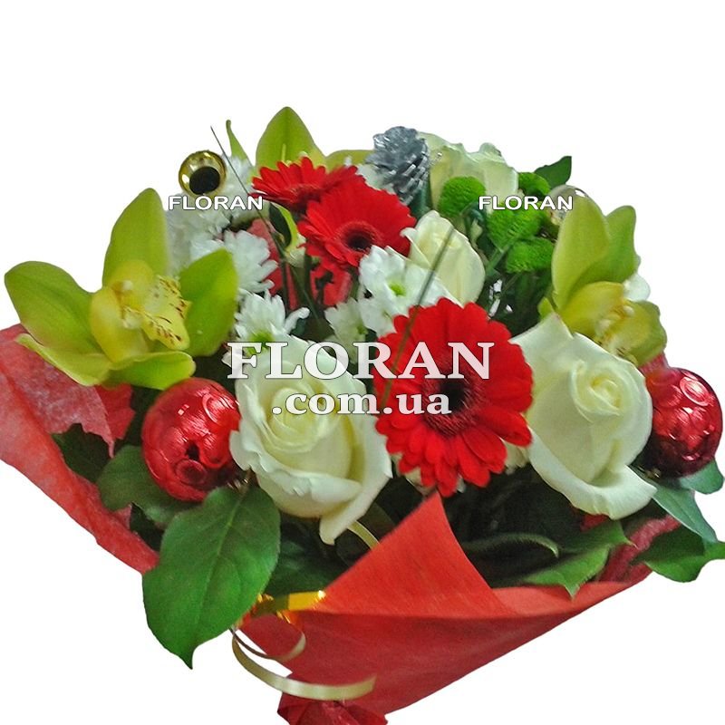 3 зеленые орхидеи, 3 красные герберы, 5 белых роз, 4 белые и зеленые хризантемы, 5 елочных шаров, упаковка