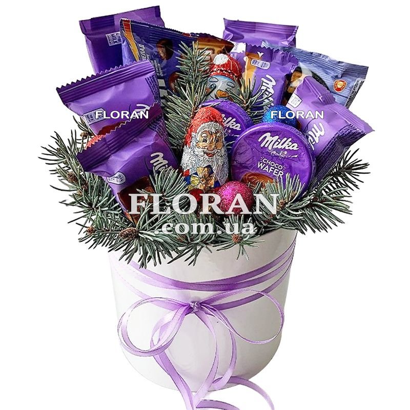 Новогодняя композиция сладостей в коробке - код товара FL-2126 - это настоящее сокровище для любителей сладкого и символ праздничного настроения. Этот набор прекрасно подходит как в качестве подарка близким, так и для создания атмосферы радости и уюта в вашем доме в преддверии Нового Года. Четыре плитки шоколада Milka весом по 90 граммов каждая приносят нежность и незабываемый вкус. Этот шоколад всегда ассоциируется с качеством и удовольствием. Две большие плитки шоколада добавляют нотку роскоши и изысканности в эту композицию. Они станут настоящим угощением для ценителей высококачественного шоколада. Два пакета печенья и два пакета вафель придают этой композиции разнообразие и текстуру. Печенье и вафли - это классические сладости, которые всегда вызывают улыбки и радость. Шоколадный батончик и две шоколадные фигурки добавляют в эту композицию игривости и оригинальности. Они придадут этому набору интересные вкусовые и визуальные акценты. Три новогодних шара придают композиции праздничный вид и символизируют приближение Нового Года. Они создадут вокруг себя волшебную атмосферу праздника. Ветки ели или сосны добавляют природную красоту и аромат, а шляпная коробка служит прекрасной упаковкой, которая завершает этот удивительный подарок. Новогодняя композиция сладостей в коробке - это не просто набор сладостей, это настоящее творение и источник радости для всех, кто его увидит. Она объединяет в себе разнообразие вкусов и форм, делая каждый момент особенным и незабываемым в преддверии самого яркого и волшебного праздника года.