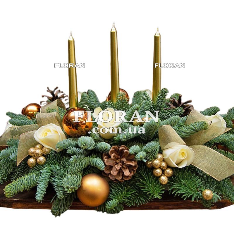 9 белых роз, 6 елочных шаров, ветки ели или сосны, 3 свечи, новогодний декор