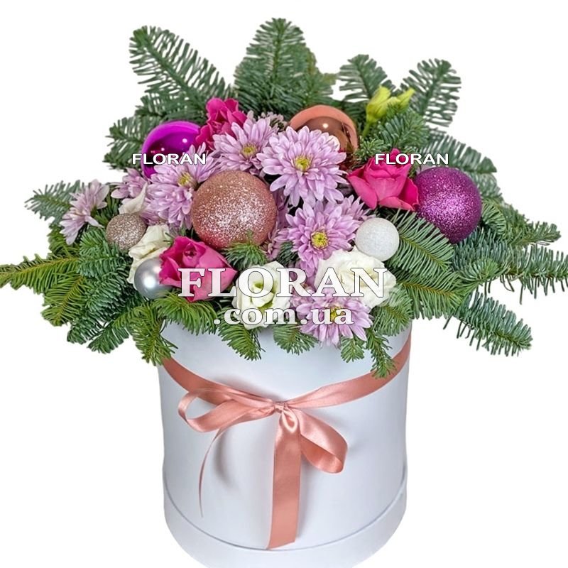 3 розовые розы, 3 розовые хризантемы, 1 эустома, 7 елочных шара, ветки ели или сосны, коробка