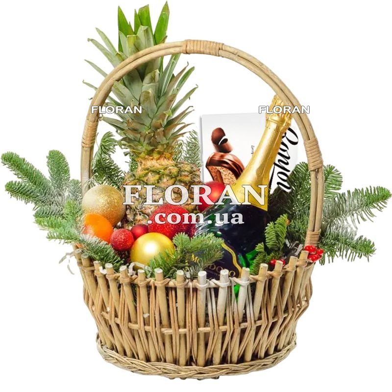 Новогодняя корзина с ананасом - код товара FL-2103. Новогодний сезон - это время волшебства, уюта и радости. И нет лучшего способа подарить эти чувства, чем через вкусные и стильные подарки, как этот уникальный состав в новогодней корзине. Ананас, свежий и сочный, - это символ свежего начала, обещания новых начинаний и великолепного начала года. Вино игристое Mondoro Asti добавляет шик и изысканность этому подарку. Он просто создан для особенных моментов, которые мы хотим запомнить навсегда. Десерт Bonjour - это маленькая доля сладости в каждом укусе, который согреет душу и принесет непередаваемое удовольствие. А мандарины, эти маленькие солнечные шары, придают нашему празднику дополнительный аромат и тепло. Новогодние шары - это символ праздника, их яркие цвета и блеск приносят радость и радужные моменты в дом, а ветки ели или сосны создают атмосферу настоящего Рождества. Когда ваш брат или сверка получат этот подарок, они будут приятно удивлены вашим вниманием и заботой. Эта корзина подарочная - идеальный способ выразить свою горячую поздравление и желания на этот новогодний сезон. Она также универсальна и подходит для многих случаев, будь то поздравление близких друзей, коллег или даже деловых партнеров. Новогодний подарок всегда приносит радость и создает праздничное настроение, и эта корзина станет незабываемым символом вашей заботы и внимания. Пусть ваш новогодний сезон будет ярким, насыщенным и полным радости!